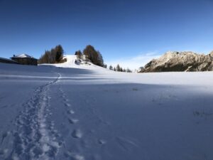 Man mano che guadagniamo quota, il bosco si apre e lascia spazio a pendii ampi e luminosi: la neve disegna linee morbide, il paesaggio si allarga e iniziamo a intravedere le cime che circondano il Cadore. Claudio, la nostra guida, ti accompagnerà a scoprire questo angolo di montagna raccontando curiosità sulla storia dei pascoli, sulla vita in malga e sulle cime che ci guardano dall’alto.